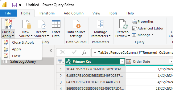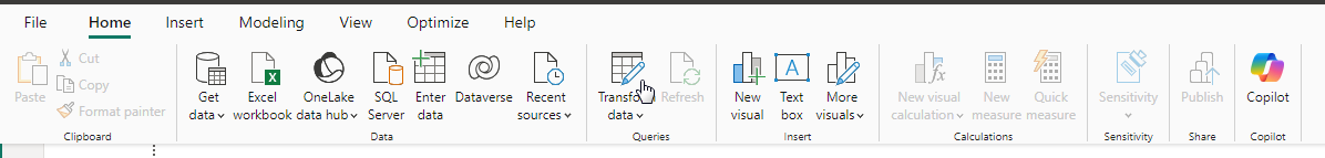 In Power BI Desktop, go to the Home tab and click Transform Data to open the Power Query Editor.
