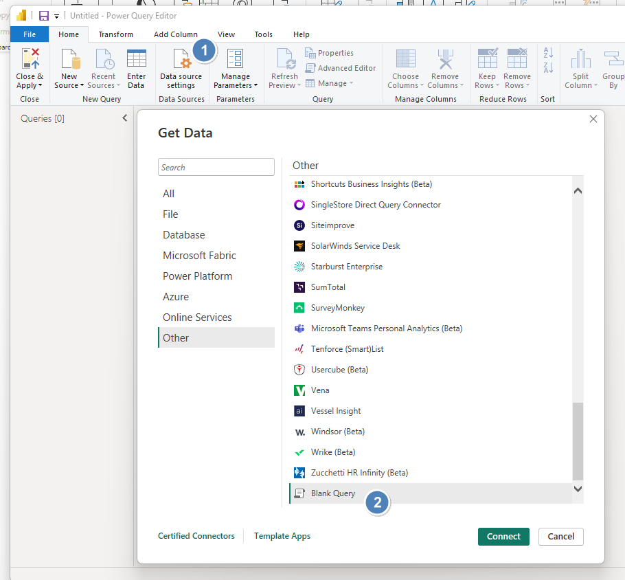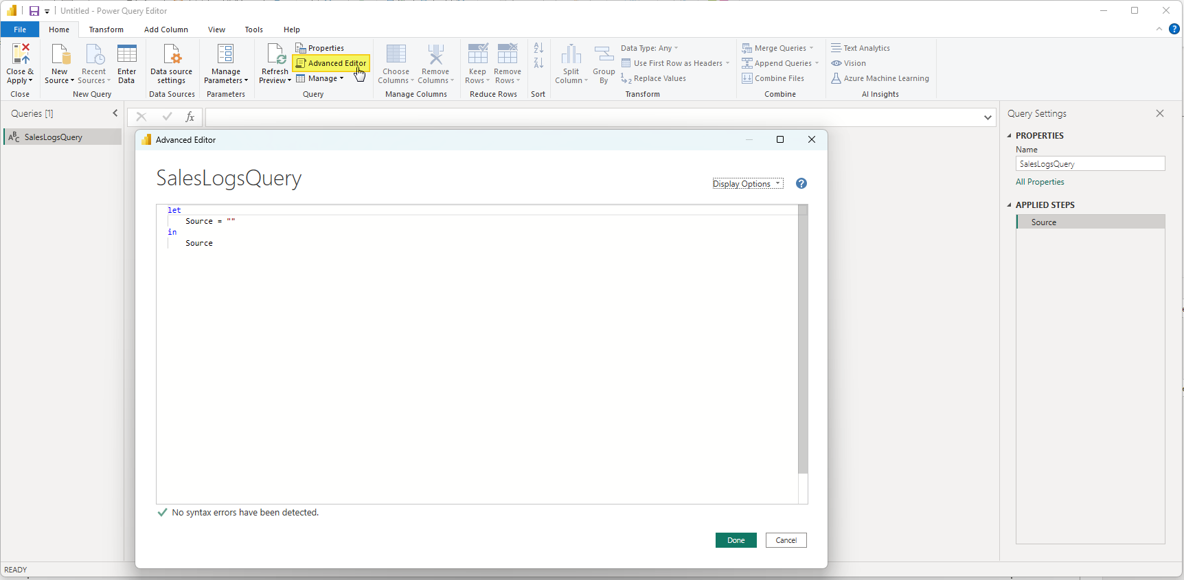 In the Power Query Editor, go to Home > New Source > Blank Query Then, open the Advanced Editor to write code for calling an API.